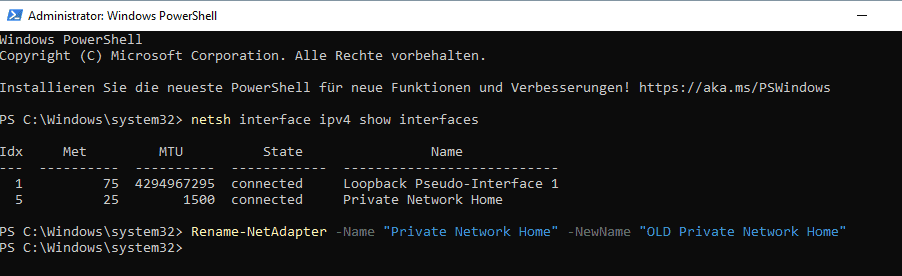 The base command is Rename-NetAdapter -Name «Current name» -NewName «New Name that you specify». All you have to do is look up the name of the current adapter and replace «Current name with it, and specify a new name in «New Name that you specify. Here is an example: Rename-NetAdapter -Name «Private Network Home» -NewName «OLD Private Network Home»