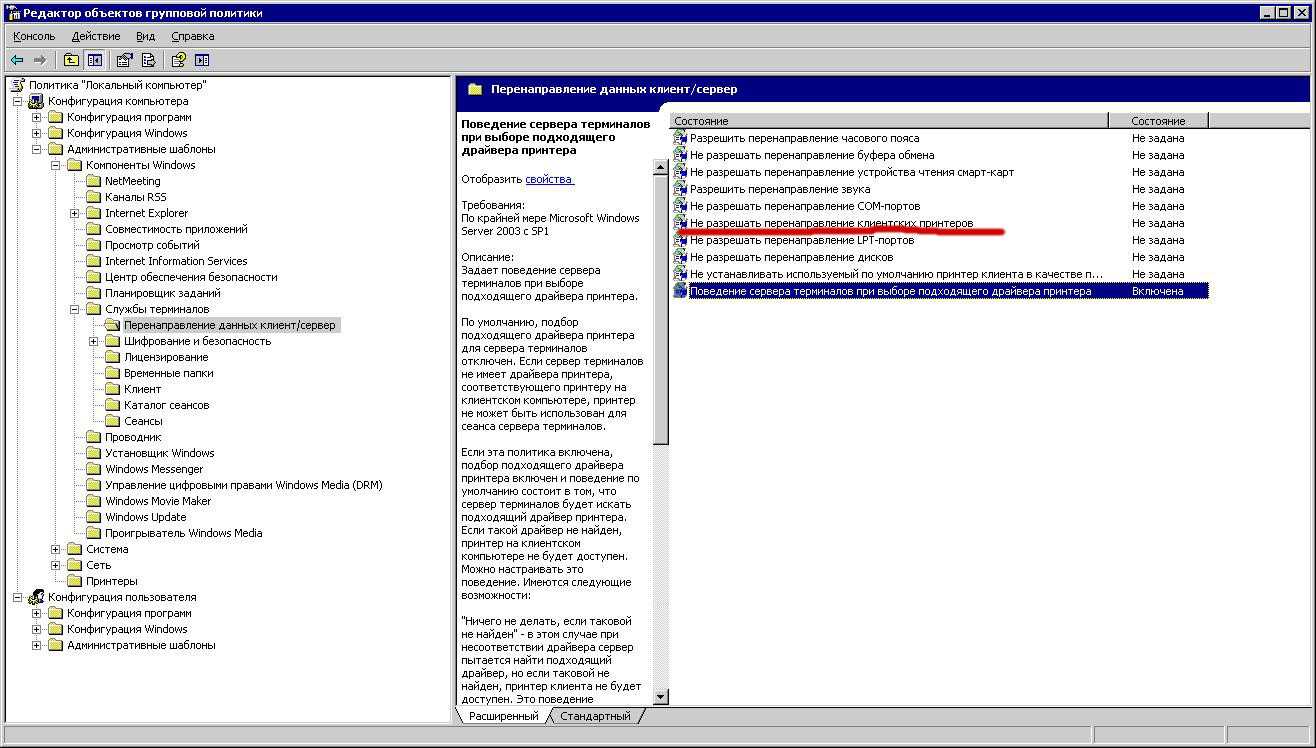 Не создаются перенаправляемые принтеры и в «диспетчере устройств» в «системных устройствах» отсутствует специальное устройство «перенаправитель устройства сервера терминалов», он же «remote desktop device redirector bus», в 2003 выглядит так: