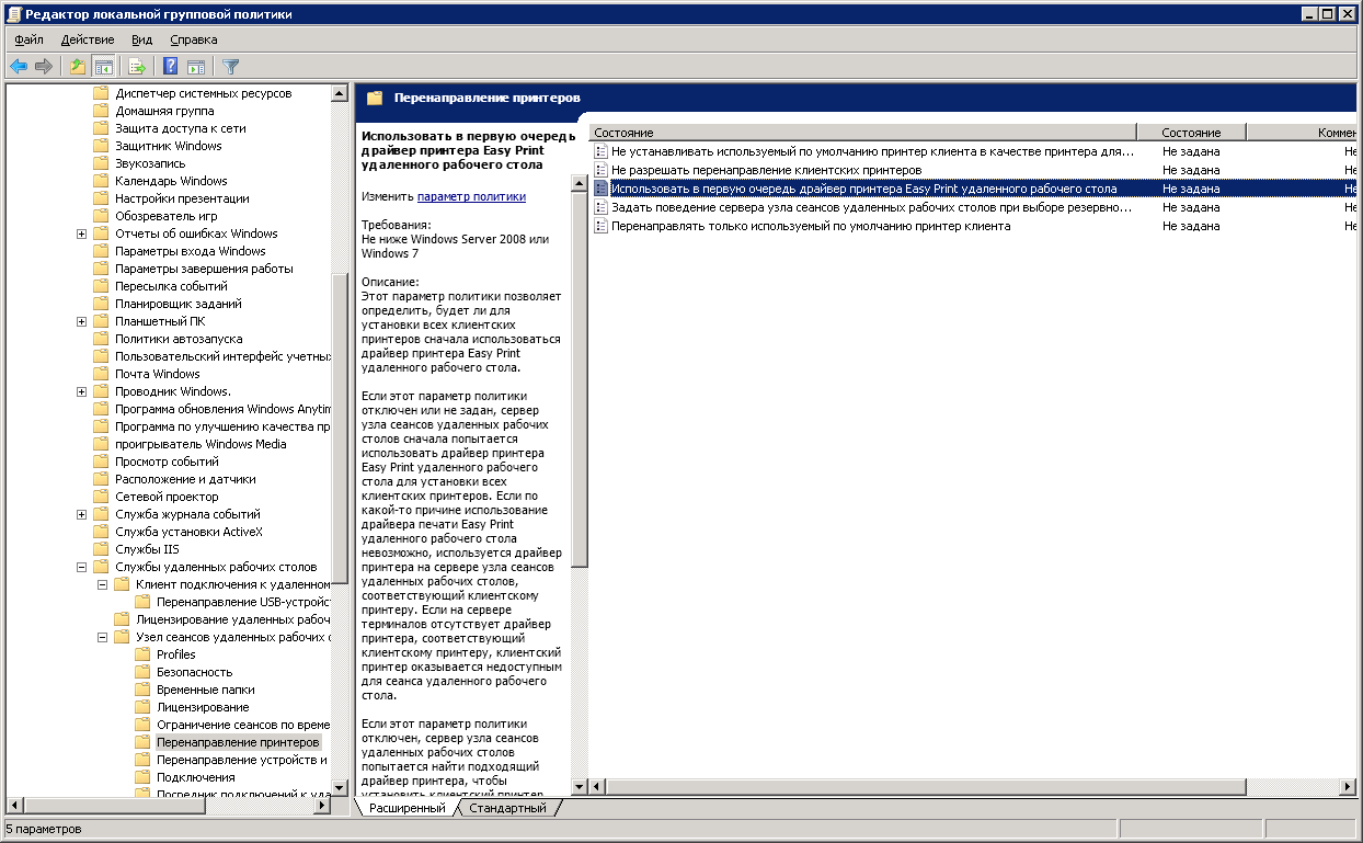 Слава Гейтсу, существует и альтернативное решение, а именно, подстановочный драйвер. Дело в том, что несмотря на различия, большинство принтеров имеет много общего и, невероятно, но факт, на них можно печатать с использованием унифицированного PCL или PS драйвера. Подстановку унифицированного драйвера можно задать только с помощью групповых политик, поэтому для установки соответствующих настроек администратору следует на контроллере домена запустить gpmc.msc (если её нет, то dsa.msc) и открыть интерфейс редактирования политики, относящейся к данному терминальному серверу. Если же сервер терминалов не входит в домен и является т.н. «stand-alone» сервером, то на нём также есть локальные групповые политики, которые можно отредактировать при помощи gpedit.msc. Интерфейс в обоих случаях одинаковый, поэтому инструкции подойдут для обоих случаев: