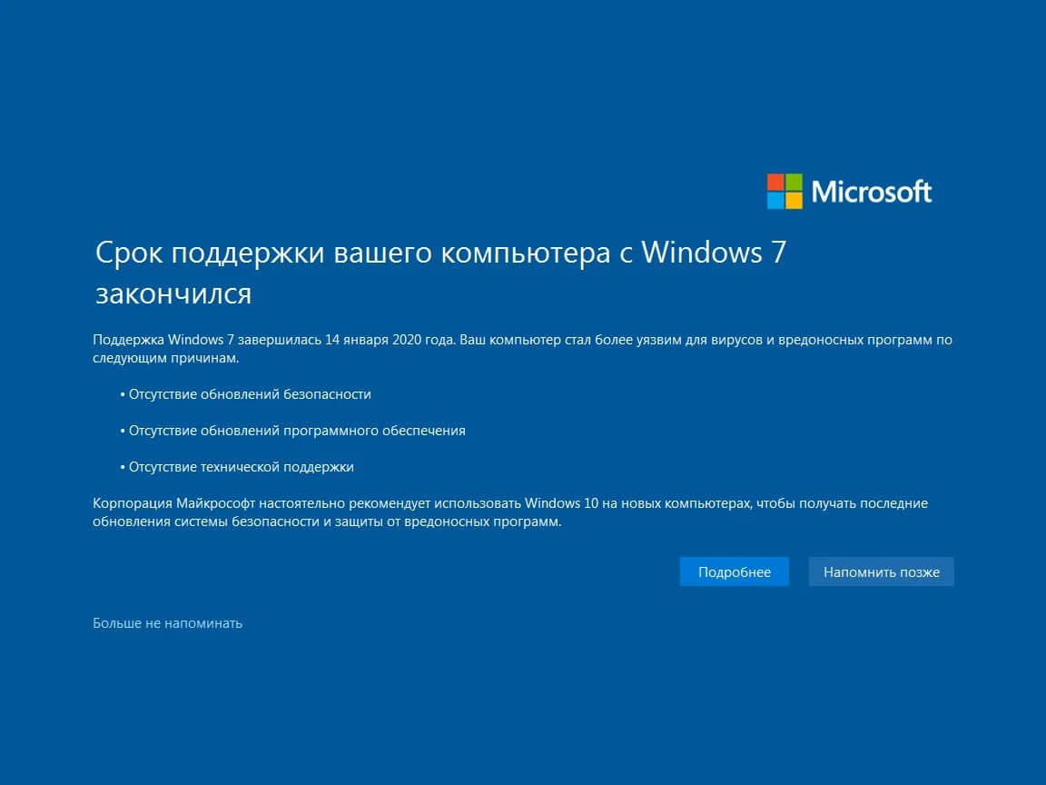 14 января 2020 года Microsoft перестала выпускать обновления для системы безопасности Windows 7 и прекратила техническую поддержку этой версии системы. Чтобы ваш компьютер продолжал обслуживаться и оставался защищенными, получая ежемесячные обновления безопасности, у вас есть возможность сделать бесплатное обновление до Windows 10.