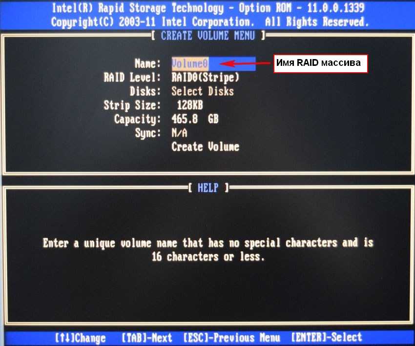 Для введения имени Raid 0 необходимо сначала нажать на пробел и затем его ввести.