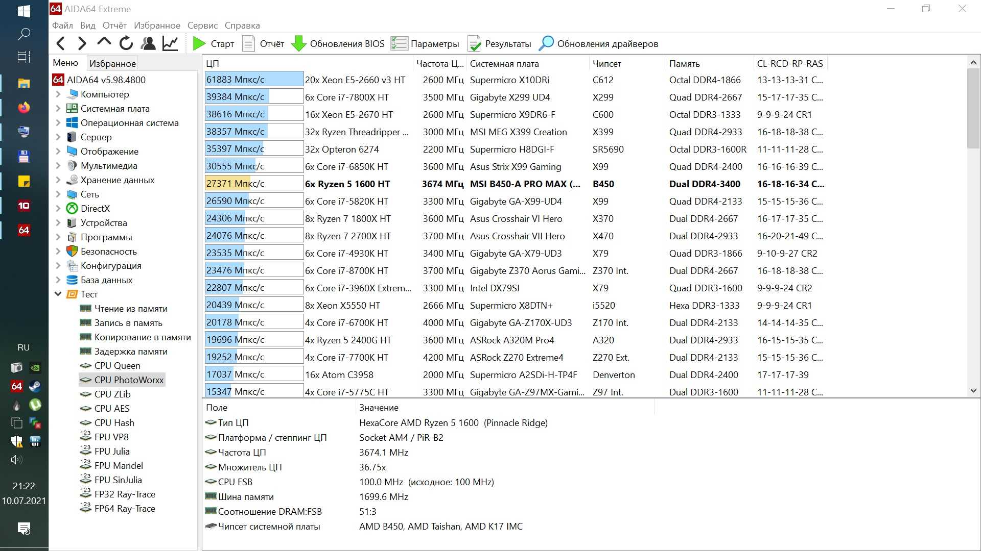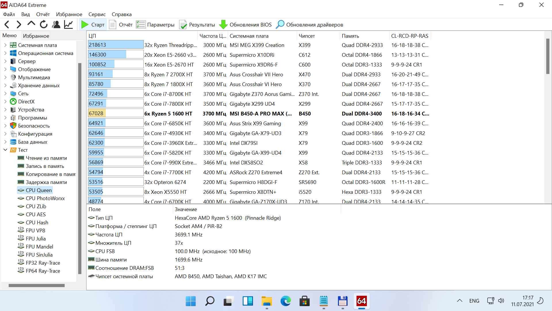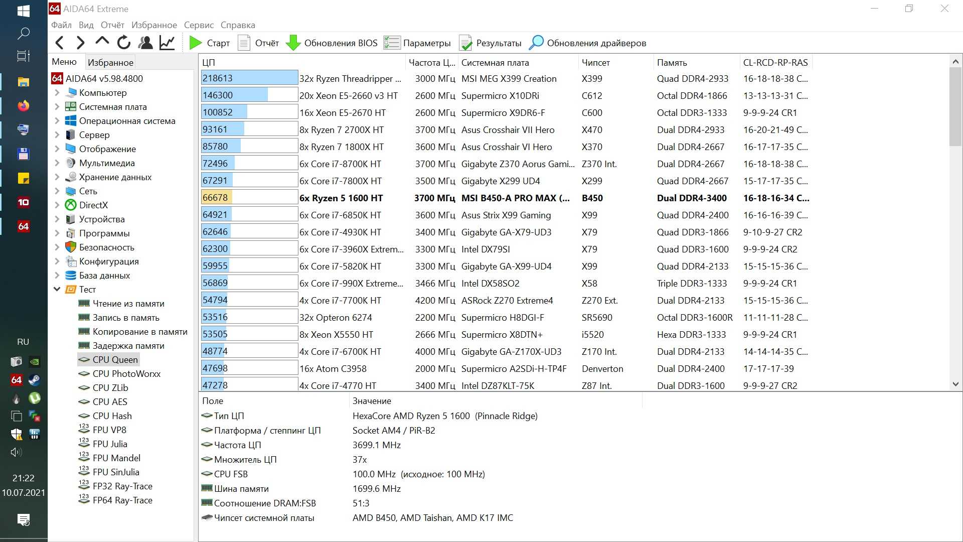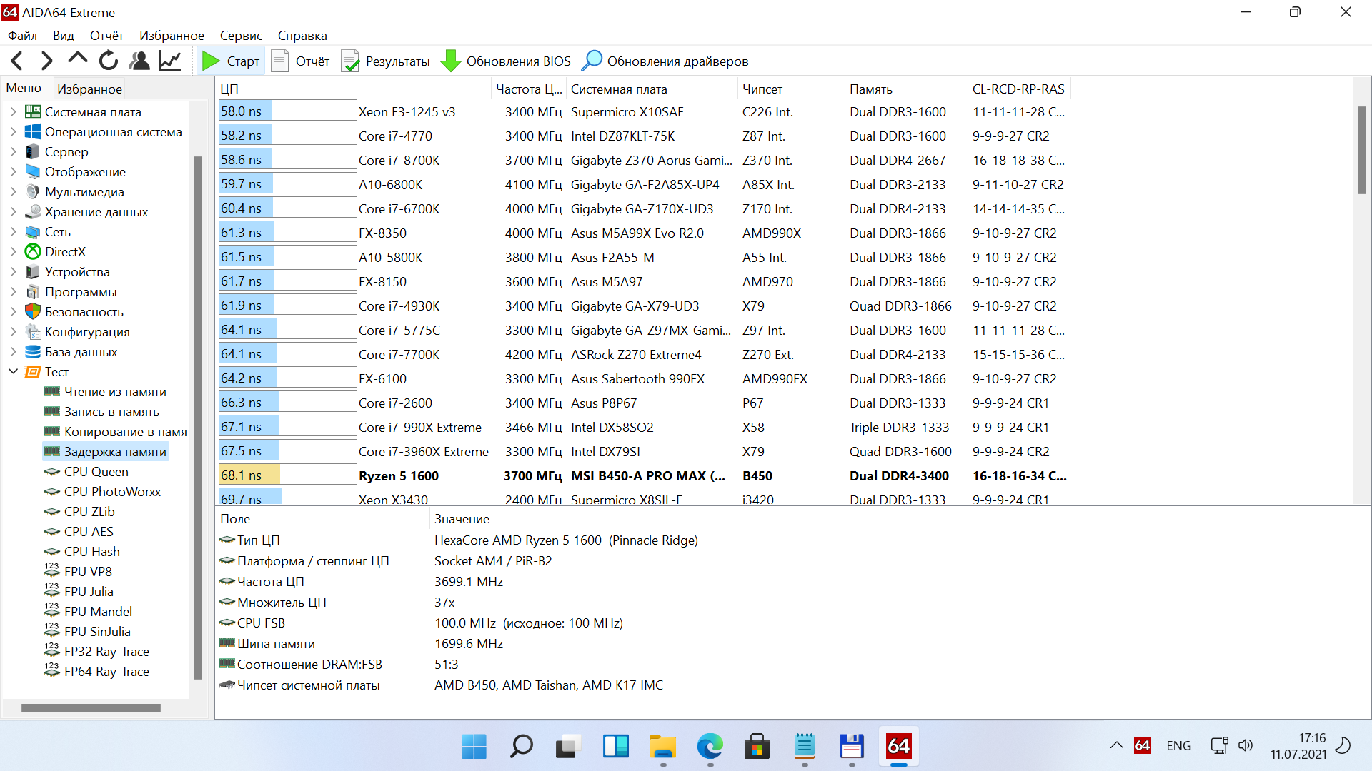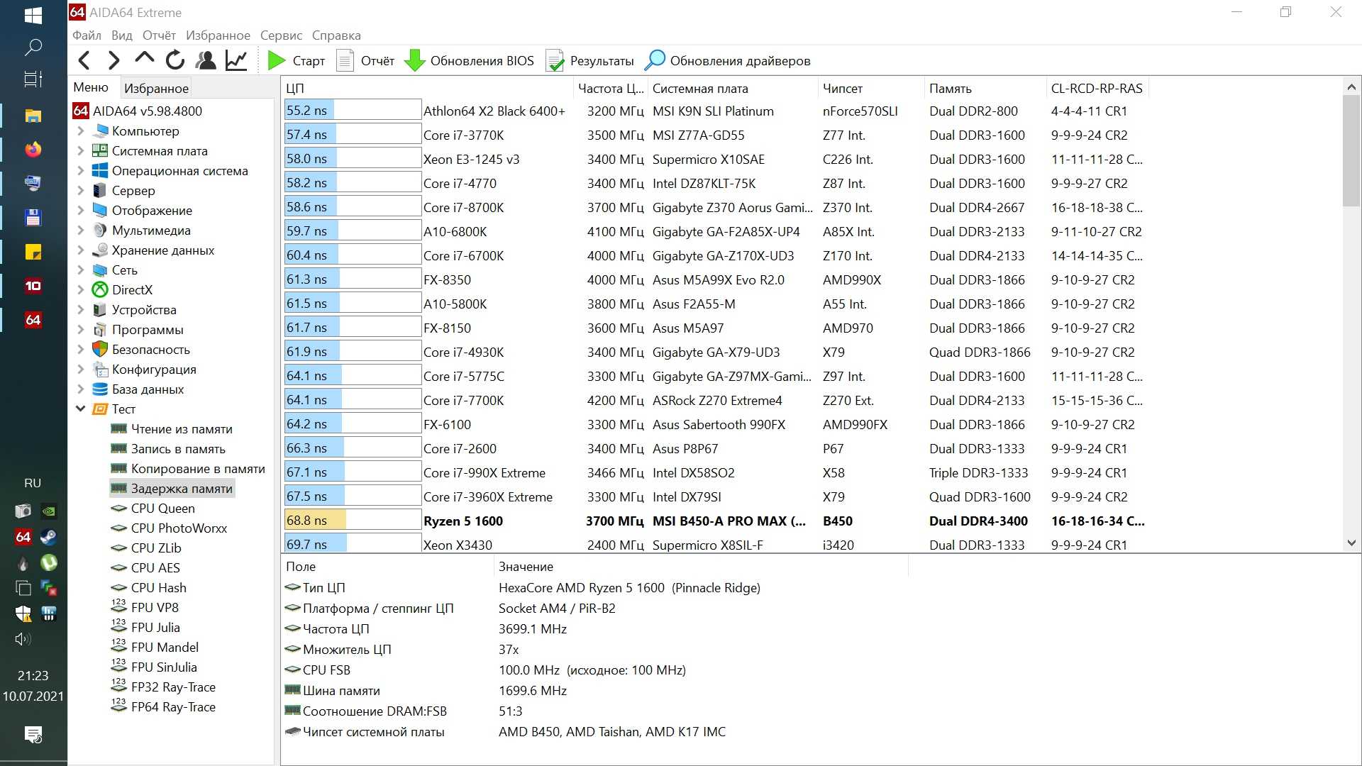 Далее будут выборочные тесты из AIDA64, сначала в Windows 10.