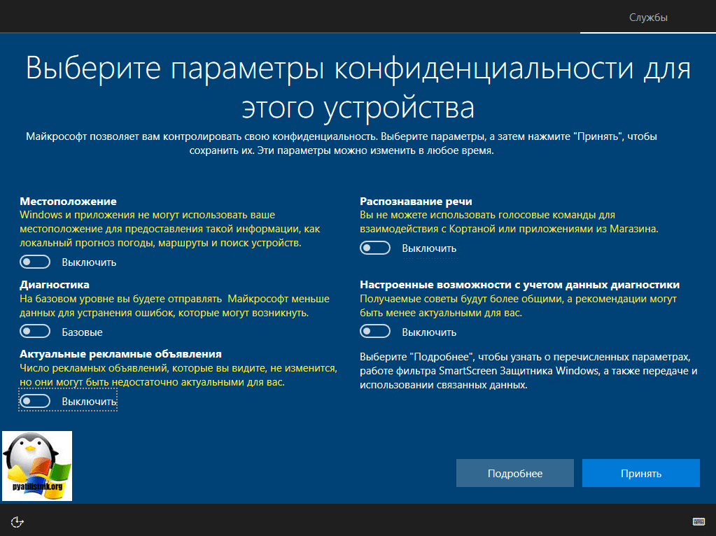 Отключаем весь то шлак, который Microsoft перечисляет на данном экране.