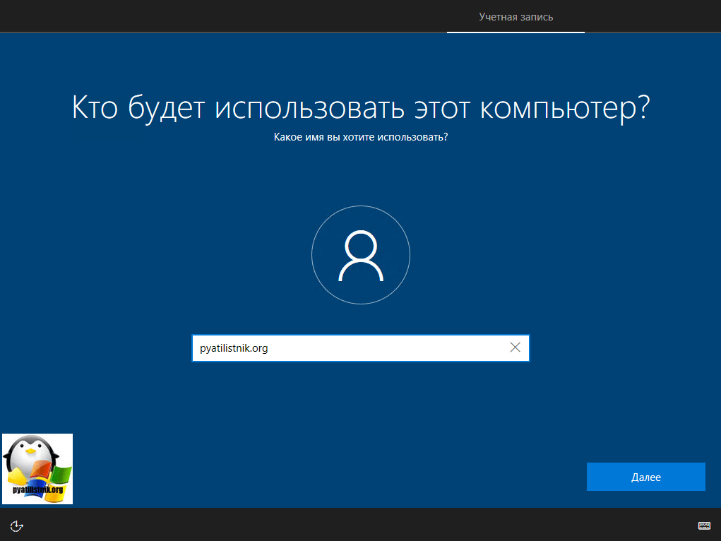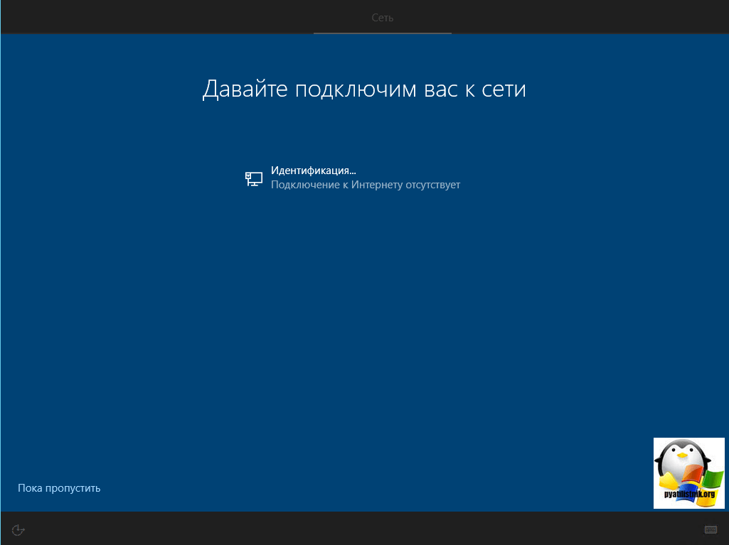 Мастер установки Windows 10 fall creators update проверит есть ли у вас выход в интернет, чаще всего его нет, поэтому идентификация не проходит, смело нажимайте в левом нижнем углу кнопку «Пока пропустить.»