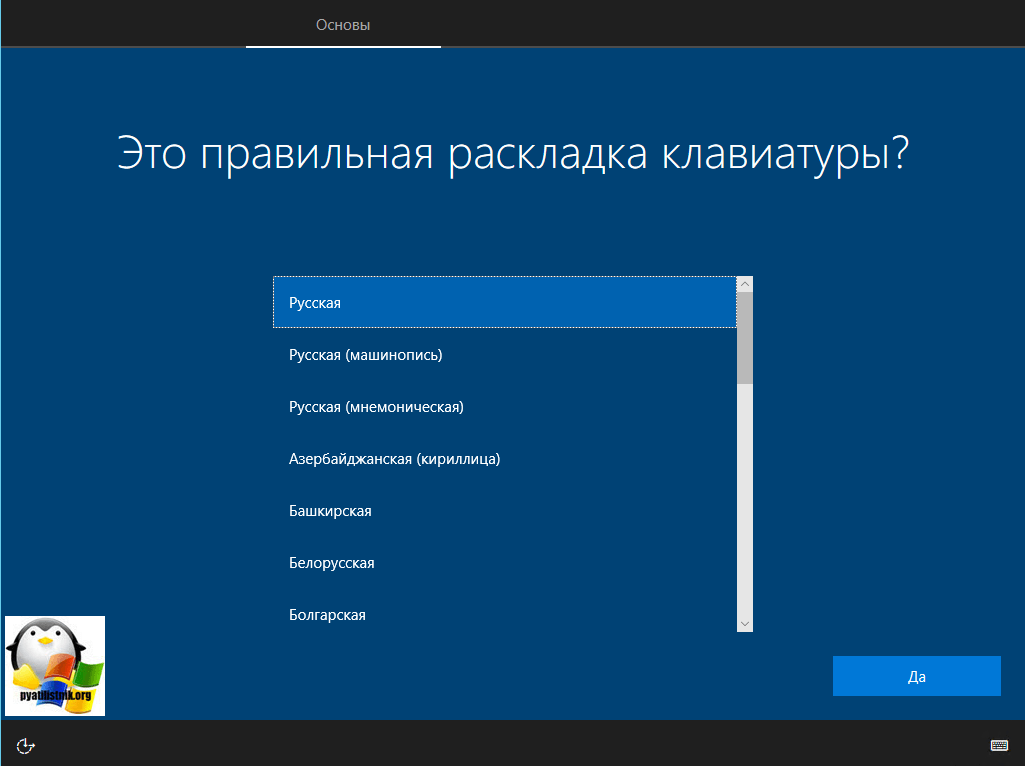 Выбираете раскладку клавиатуры, которая будет по умолчанию.