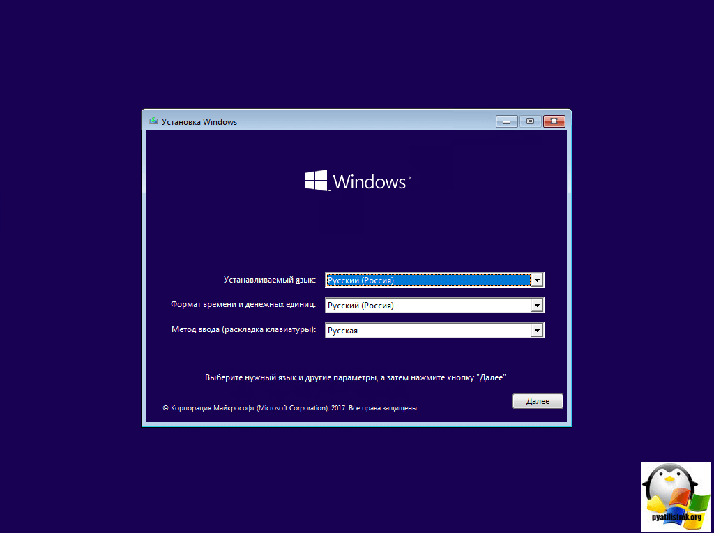На первом окне вам необходимо будет выбрать язык установочного меню и раскладку клавиатуры, все это влияет, исключительно на данный мастер инсталляции, но не на язык внутри системы. В моем случае, все варианты, это только «Русский»