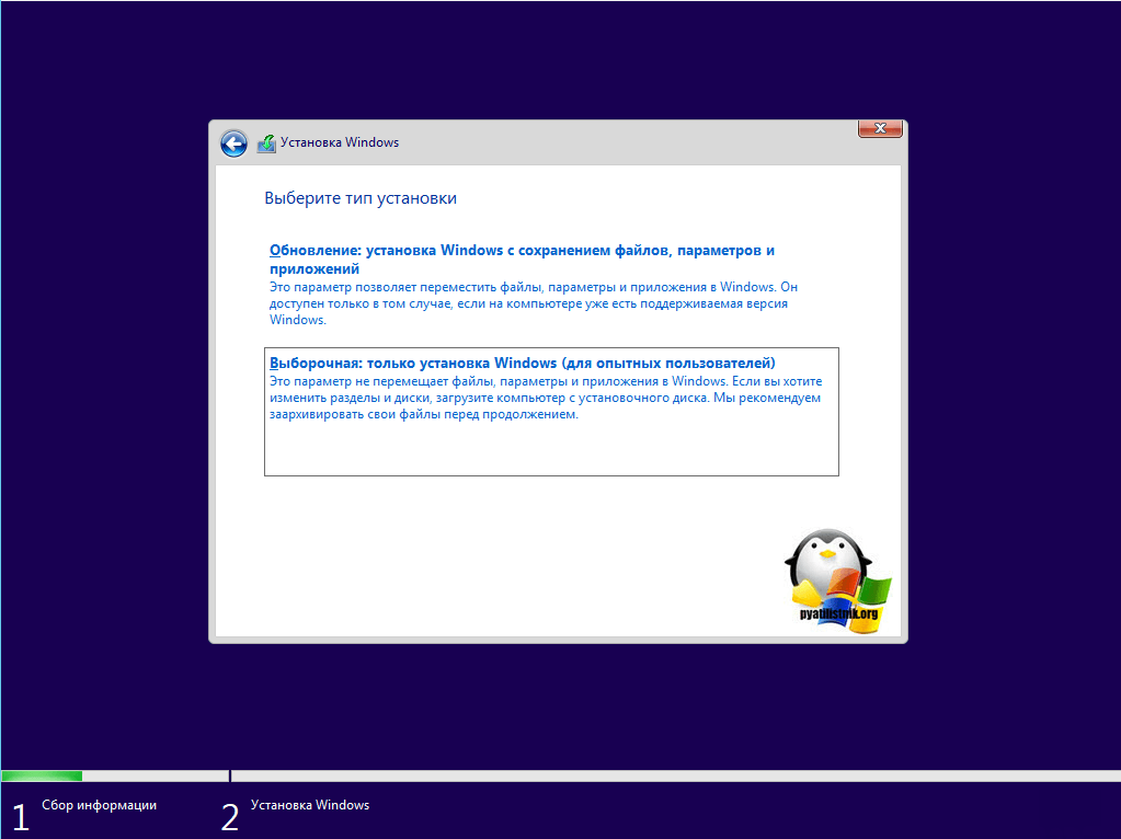 Так как у нас чистая установка windows 10 fall creators update версия 1709, то нам подойдет только «Выборочная: только установка Windows (Для опытных пользователей)»