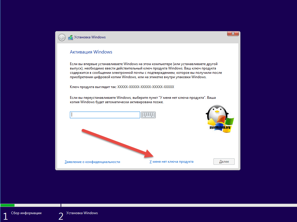 Теперь при наличии ключа продукта Windows 10, вам необходимо его ввести, если его нет, то пропускаем этот этап, нажимая «У меня нет ключа продукта»