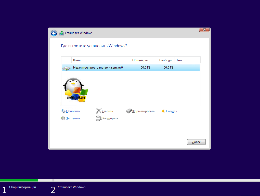 Теперь нам необходимо определиться на какое дисковое пространство будет установлена наша ОС, в моем примере у меня чистый HDD, в виде незанятого пространства, у вас же может быть, что на диске будут другие разделы, удаляете все, что не нужно, в результате чего вы так же сможете получить не размеченное место, на которое все и будем делать.