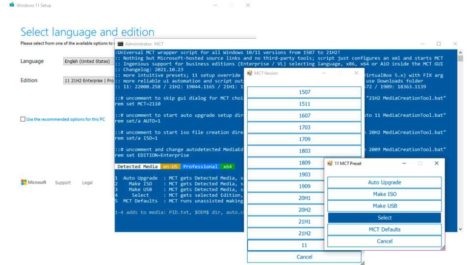После распаковки архива c Universal Media Creation Tool откройте файл с расширением .bat. Запустится скрипт, который предложит вам выбрать нужную версию ОС (в нашем случае Windows 11). После выбора операционной системы начнется процесс автоматической установки. В ключевых моментах обновления скрипт несколько раз перезагрузит компьютер — это нормально. Сам процесс обновления с Windows 8 до Windows 11 займет больше часа.