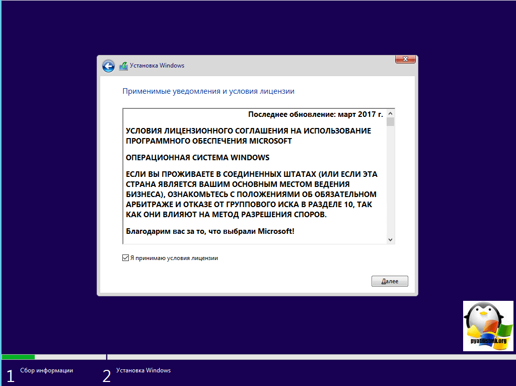 - В окне программы установки оставьте или снимите отметку Я хочу помочь улучшить Windows, и нажмите кнопку Далее. Программа установки автоматически будет использовать интернет-соединение, чтобы получить обновления, драйвера и дополнительные компоненты.