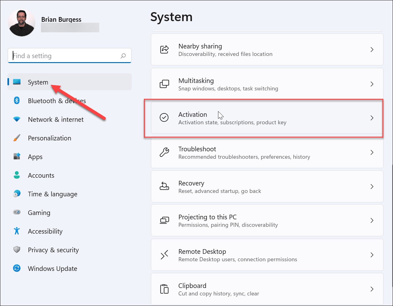 In Windows 11, head to Settings > System > Activation. (Alternatively, open your Start Menu, start typing “activation settings,” then hit enter when Activation settings pop up in search.)