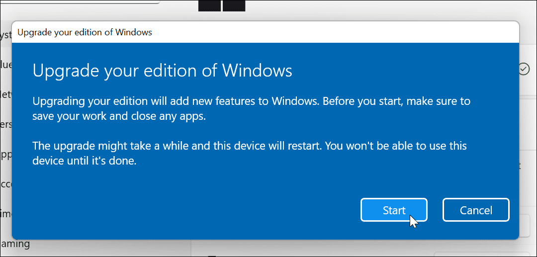 Если ключ продукта распознан, вы увидите сообщение о том, что вы обновляете свою версию Windows. Прежде чем начать, убедитесь, что вы сохранили свою работу и все важные файлы, а также закройте все открытые приложения.
