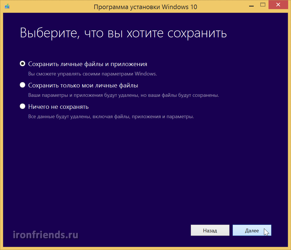Мы же сегодня хотим мягко обновится, поэтому выбираем сохранение личной информации, установленных программ и текущих настроек. Устанавливаем систему.