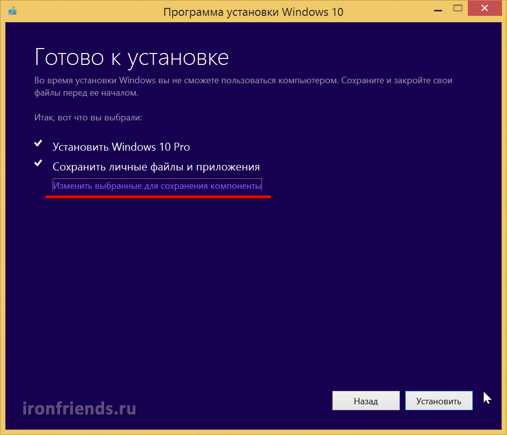 По умолчанию предлагается установить Windows 10 с сохранением всех личных файлов и программ.