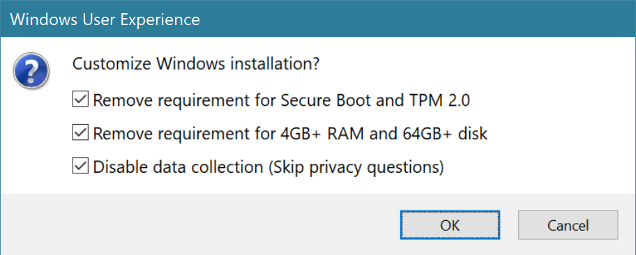 6. Check remove requirement for TPM, 4GB and data collection if you want. These are optional, but recommended and you must click Ok.