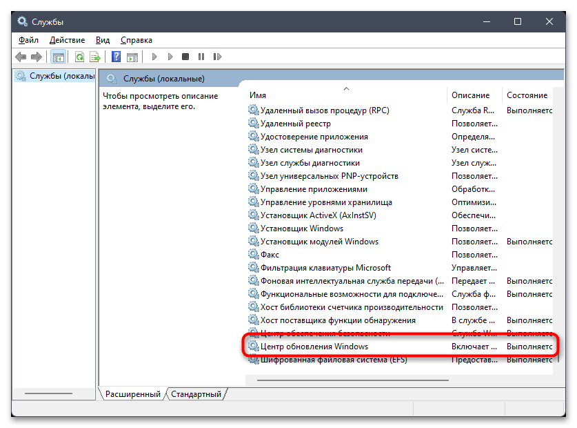Служба, связанная с обновлениями Windows, ранее была отключена вручную, поэтому запустите ее через то же самое окно, о котором шла речь в инструкции. Как только служба перейдет в активное состояние, можете вручную запустить поиск апдейтов, дождаться завершения и установки файлов. Если проблема не была решена, переходите к следующим методам.