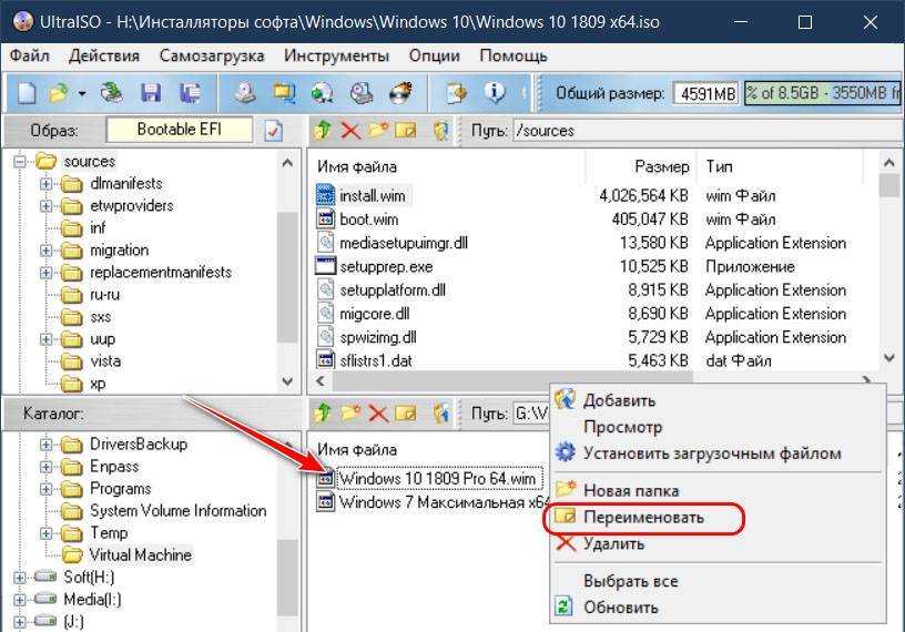 В нижней панели окна программы на диске находим WIM-файл нашего бэкапа. Переименовываем его на install.wim.