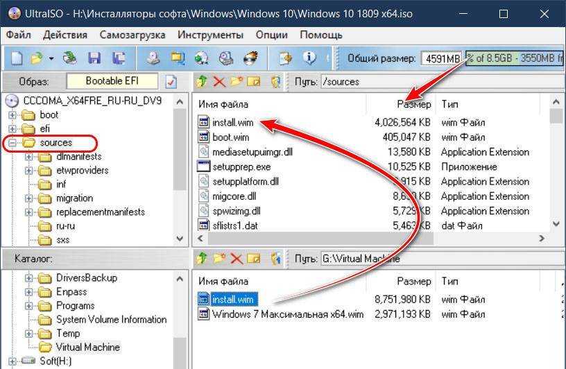 И перетаскиваем в верхнюю панель UltraISO, в открытую папку «sources».