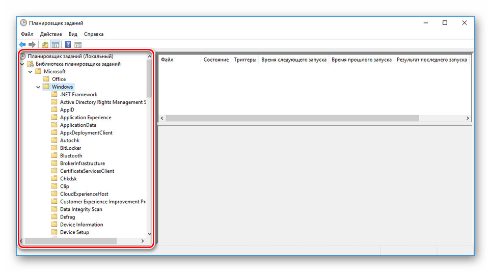 - В левом столбце откройте «Библиотека Планировщика заданий», а затем поочередно перейдите сначала в раздел «Microsoft», а затем в раздел «Windows».