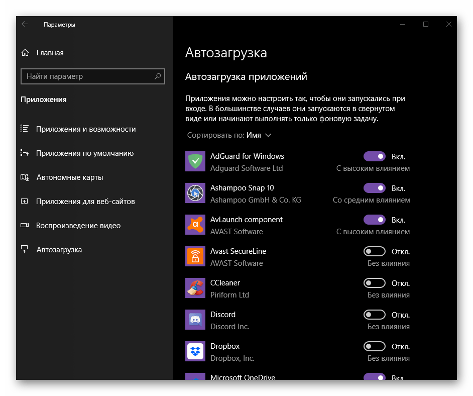 - Настроить включение или выключение автозагрузки в Windows 10 путем выбора состояния в соответствующем столбце.