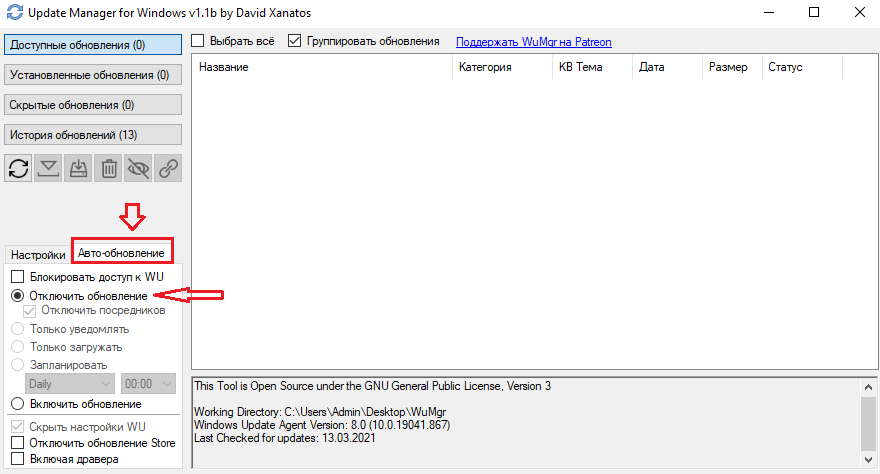 Теперь, нам нужно отключить автоматичесскую установку обновлений на нашей системе. Для этого, распакуйте архив в любую папку и запустите утилиту (исполняемый файл: wumgr.exe) от имени Администратора. В открывшемся окне, выбираем « Авто-обновление » и выбираем « Отключить обновления » . При необходимости, можем отключить обновления для драйверов и Store:
