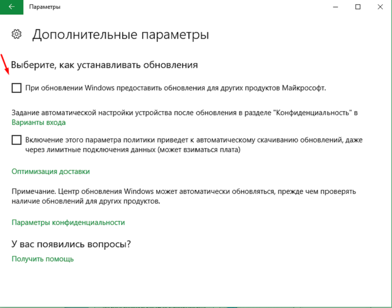 - Снимите галочку с пункта «При обновлении Виндоус предоставить обновления для других продуктов Майкрософт»;