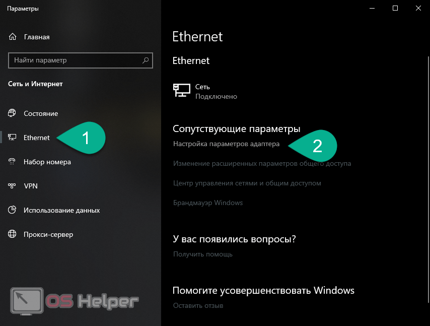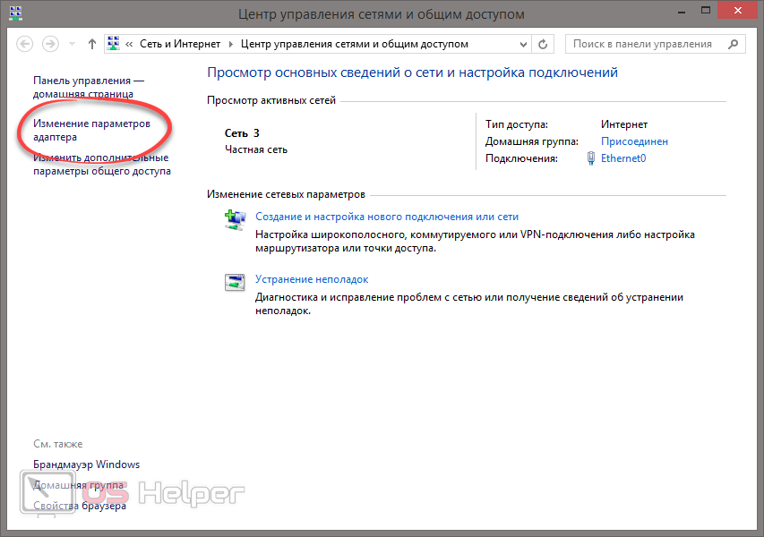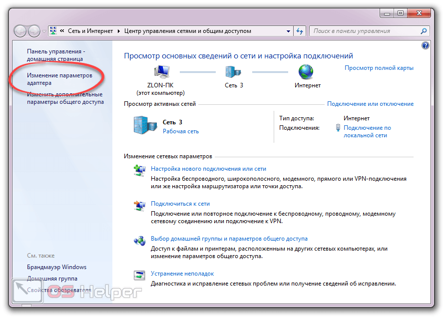 - Точно так же, как и в предыдущих ОС, выбираем «Изменение параметров адаптера».