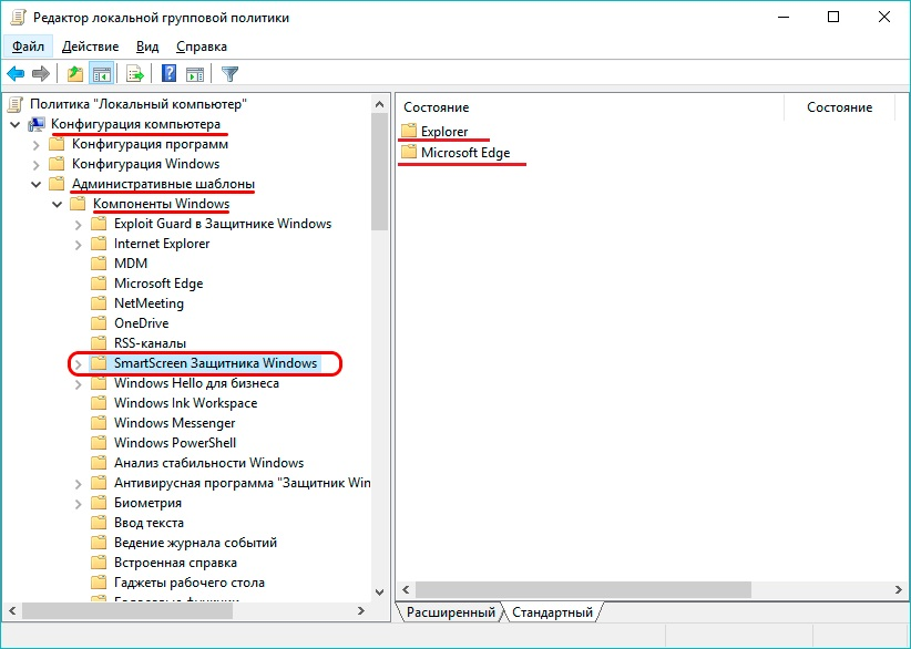 - Путь до искомого объекта такой: КонфигурацияКомпьютера\АдминистративныеШаблоны\КомпонентыWindows\SmartScreenЗащитникаWindows;