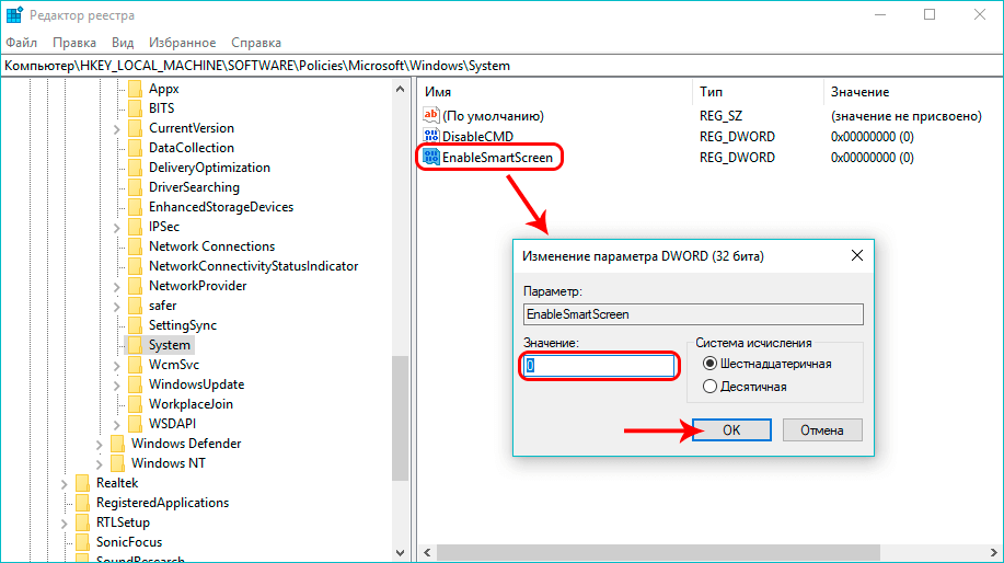 8. Щелкните дважды по переменной «EnableSmartScreen» и введите значение «0» (без кавычек).