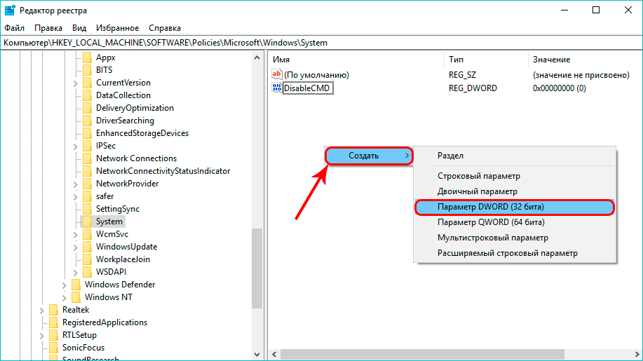 В искомой папочке делаем клик ПКМ по пустому пространству и переходим в «Создать» —» ПараметрDWORD (32бита) не зависимо от разрядности вашей ОС;