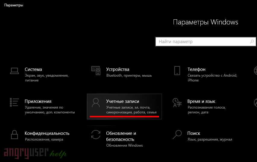 Далее перейдем в меню «Все параметры» -> раздел «Учетные записи».