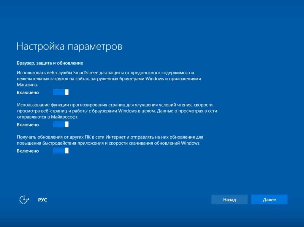 А вот и SmartScreen – та самая служба, которая частенько бывает одной из причин замедления Windows 10, в обмен на так называемую «безопасность» и «защиту». Здесь же присутствует и второй пункт – «Прогнозирование страниц», который разрешает официально шпионить во время серфинга в интернете, а третий пункт про обновления ПК – самый интересный. Он задействует на системе подобие торрент-клиента, скачивающего и раздающего обновления по сети. Естественно это сказывается на скорости интернета, задержке сигнала в онлайн-играх и прочем. Здесь снова нужно все ползунки выключить и нажать «Далее».