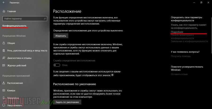 Во вкладке «Расположение», вы можете отключить определение местоположения для вашей учетной записи. Здесь вы можете отключить журнал сведений о своем расположении, а также отключить приложения, которым разрешено собирать сведения о вашем местоположении.