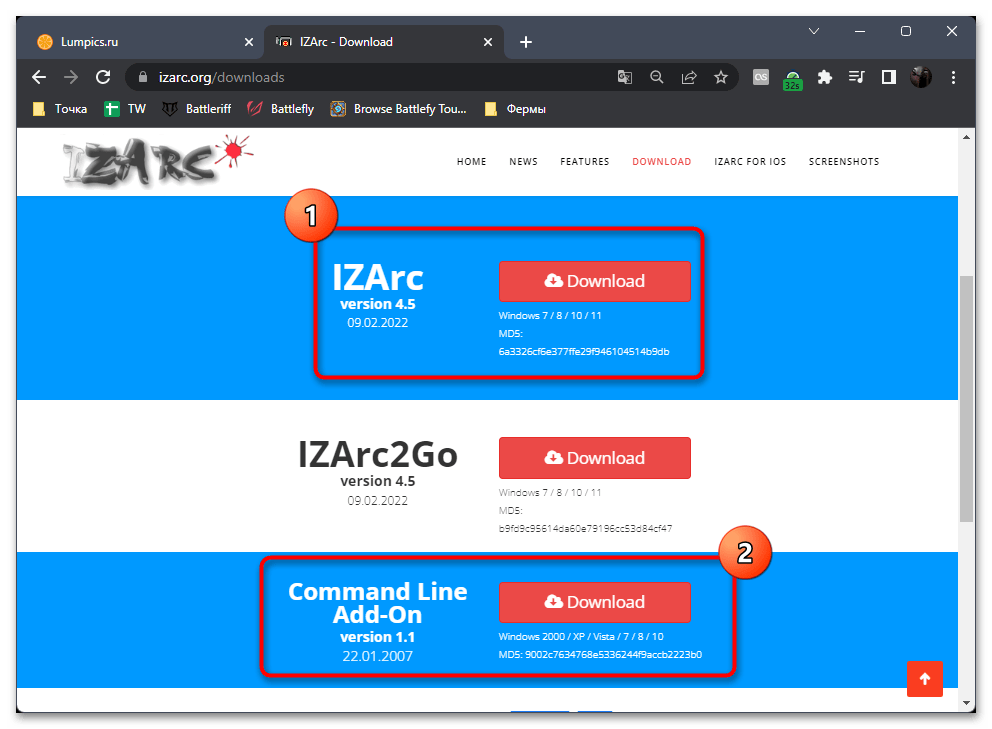 - На официальном сайте выберите базовую версию IZArc или дополнение для консоли. При скачивании второго варианта приложения прочитайте представленную разработчиками документацию, чтобы понять, какие команды следует вводить при взаимодействии с дополнением.