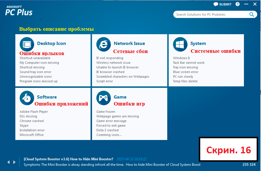 - В главном меню выбрать раздел с описанием проблемы (Скрин.16), а именно: