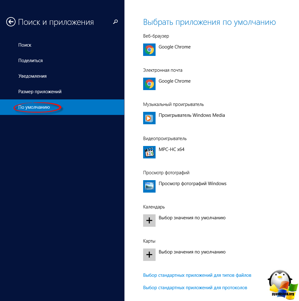 Далее нас будет интересовать пункт в левой части под названием Поиск и приложения, именно он отвечает в интерфейсе Metro за ассоциации файлов windows