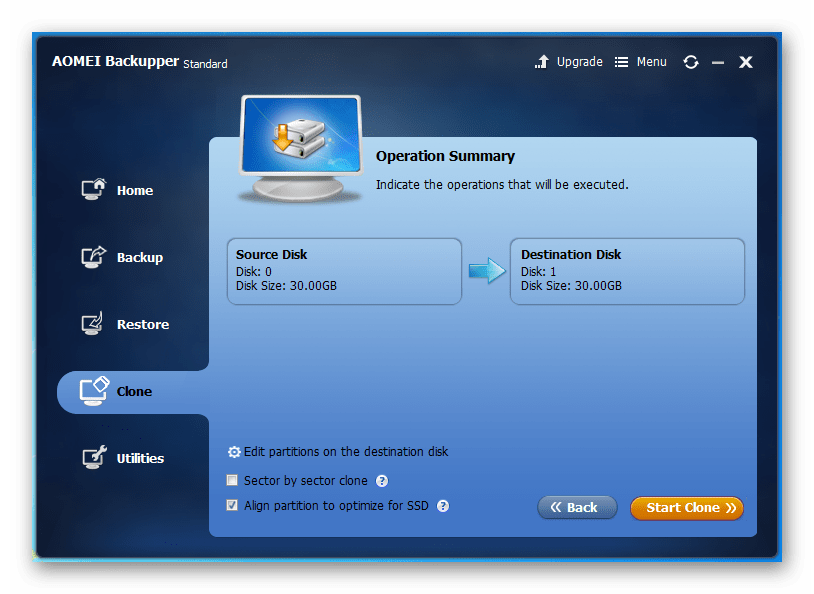 В сегодняшней статье мы воспользуемся таким инструментом программы AOMEI Backupper Standard под названием Клонирование!