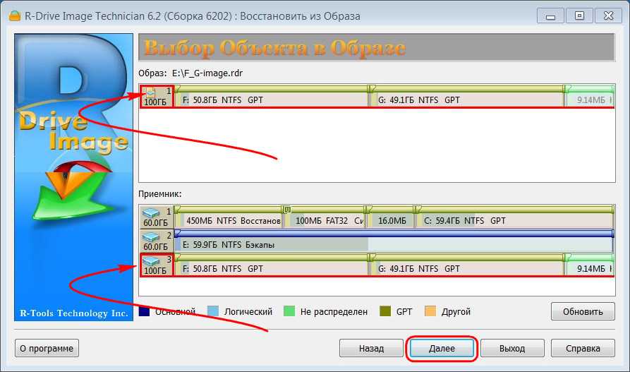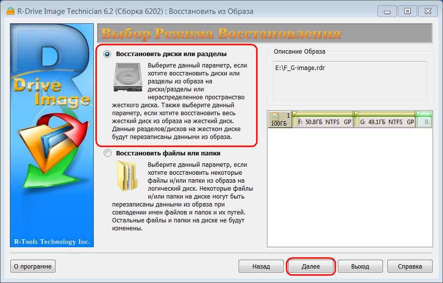 Если жёсткий диск в результате каких-то нежелательных операций утратил свою структуру и содержимое, а, возможно, он пришёл в непригодность и заменён на новый, можем восстановить и его разметку, и всё, что хранилось на его разделах на момент создания бэкапа. В главном окне программы жмём «Восстановить из образа», указываем путь к файлу бэкапа «.rdr». Выбираем восстановление дисков и разделов.
