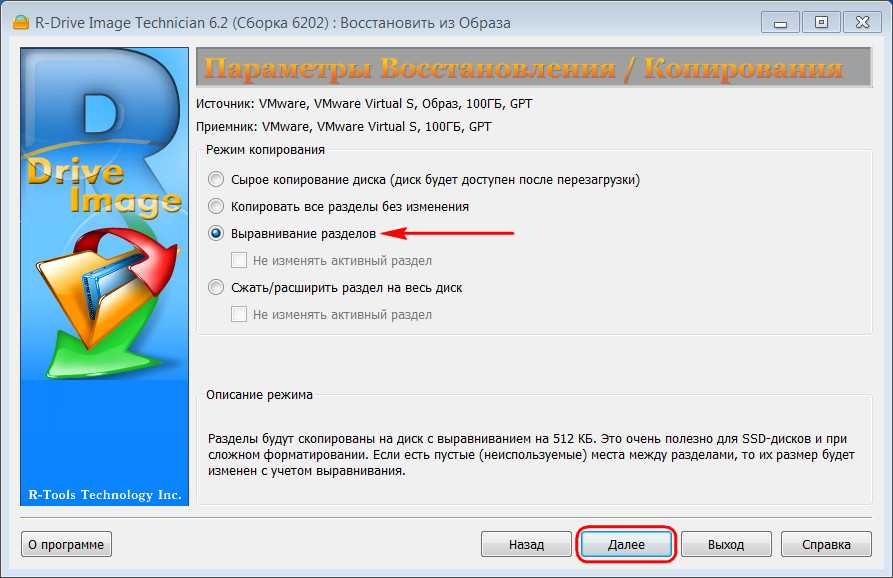 На следующем шаге выбираем «Выравнивание разделов». Такая опция – огромный плюс R-Drive Image. При её выборе программа будет не «бездумно» клонировать структуру старого носителя, а отслеживать, чтобы разделы на носителе назначения были выровненными. Т.е. чтобы их начало совпадало с началом первого сектора хранения данных на самом устройстве информации. Выровненные разделы увеличивают скорость проведения операций HDD и экономят ресурс SSD.