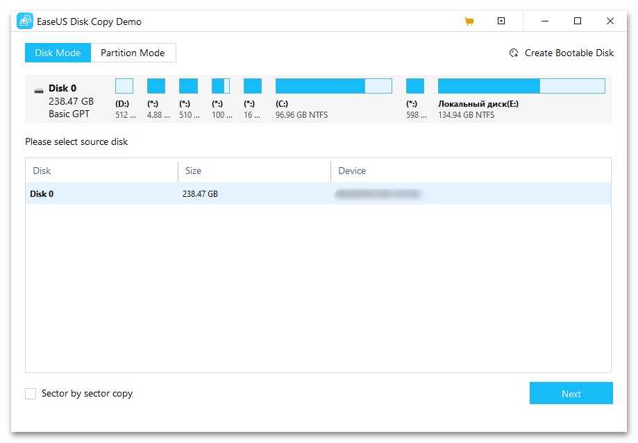 Если вас интересует только клонирование содержимого винчестера на твердотельный накопитель без дополнительных инструментов, которые, например, упоминались при описании предыдущих программ, то компания EaseUS предлагает узкоспециализированную профессиональную утилиту Disc Copy. Она поддерживает отдельно средства клонирования дисков и разделов, причем тип таблицы (MBR или GPT) для нее значения не имеет.