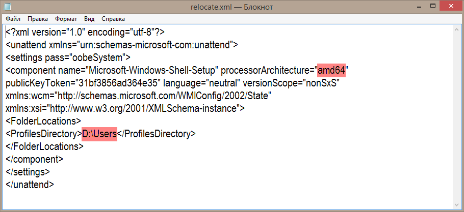 - D:\Users — новое расположение папки «Пользователи».