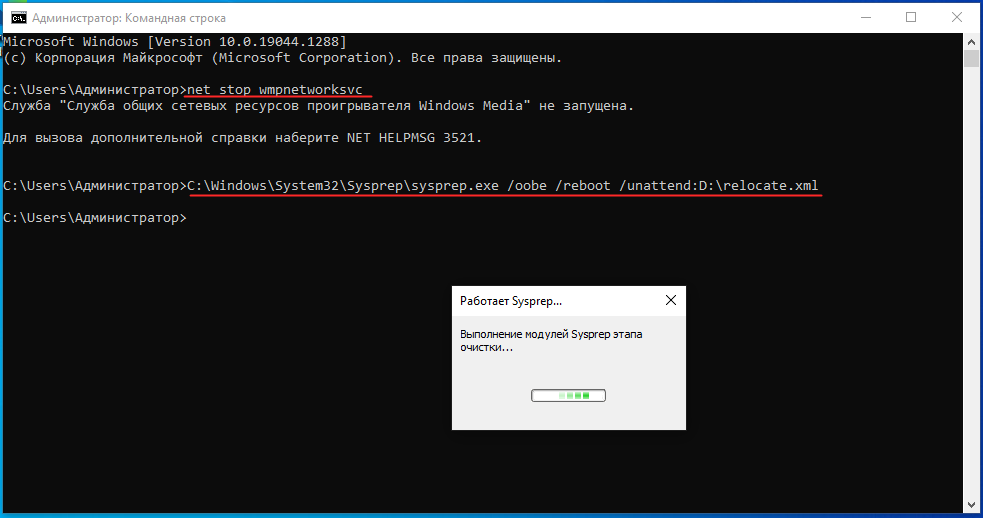 Первая команда останавливает службу общих сетевых ресурсов проигрывателя Windows Media, если та запущена. Вторая команда запускает утилиту Sysprep с аргументами, в качестве одного из которых передается путь к файлу ответов relocate.xml. При выполнении второй команды на экране появится окошко Sysprep, нажмите в нём «OK». В результате компьютер будет перезагружен, и вы попадете на экран OOBE, на котором вам нужно будет выбрать регион, язык и прочие параметры предварительной настройки операционной системы.