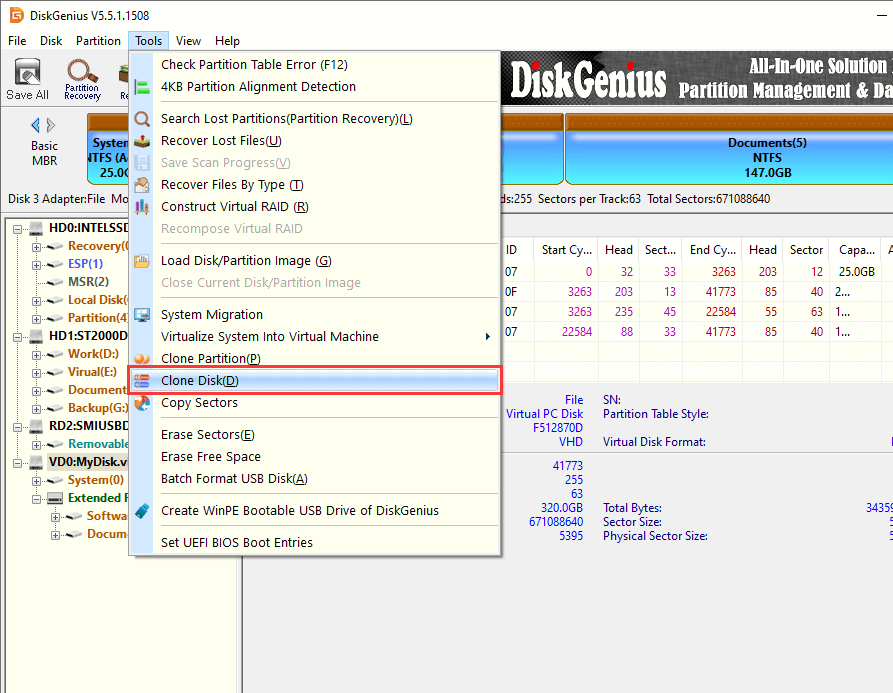 1. In DiskGenius, click Tools and choose Clone Disk option as below: