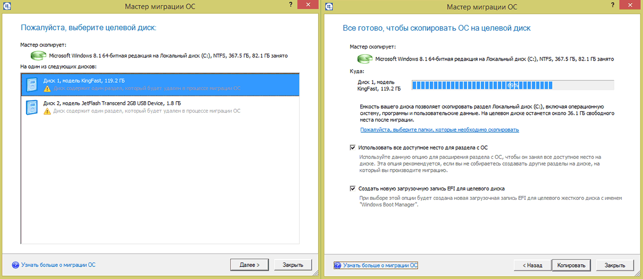 После завершения процедуры целевой диск автоматически становится загрузочным, то есть вам ничего в загрузочном меню менять не нужно. Сам процесс переноса может занять немало времени, но в любом случае меньше, чем при инсталляции системы заново.