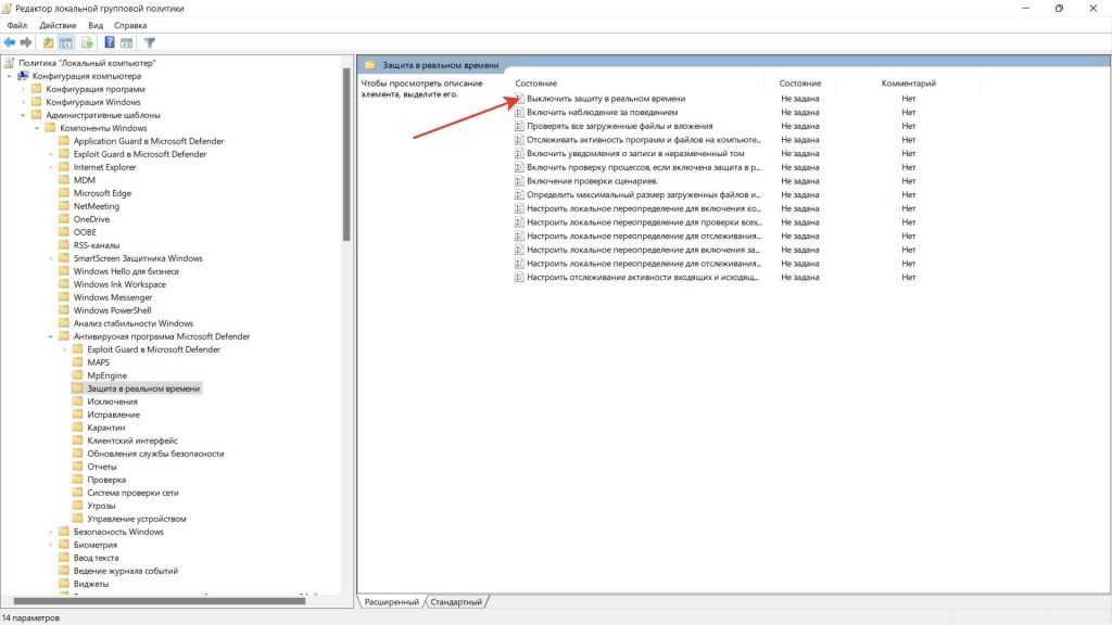 - Перейдите в папку «Защита в режиме реального времени» и включите политику «Выключить защиту в реальном времени».