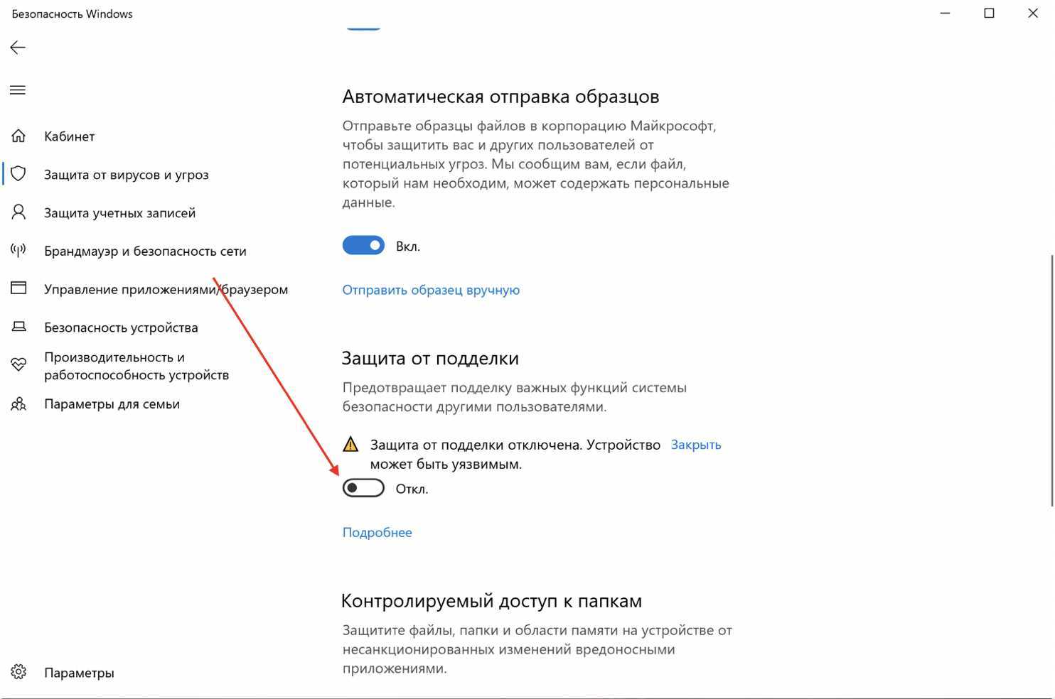 - Если вам необходимо отключить «Безопасность Windows», чтобы запустить какие-то программы, которые модифицируют работу системного антивируса, отключите пункт «Защита от подделки» в этом же окне.