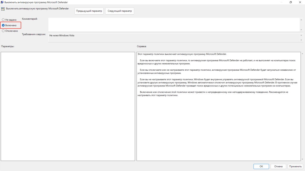 - Откройте параметр «Выключить антивирусную программу Microsoft Defender», выберите пункт «Включено» и примените настройки.