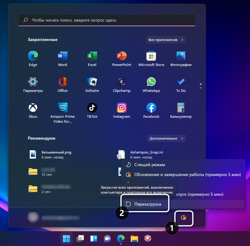 Загрузка системы в безопасном режиме – необходимый процесс, без которого у вас не получится назначить себя владельцем папки с файлами, где и находятся исполняемые файлы Защитника. Нажмите кнопку выключения в меню «Пуск» и отправьте компьютер на перезагрузку, предварительно зажав клавишу Shift. Это означает, что следующий запуск произведется с дополнительными параметрами.