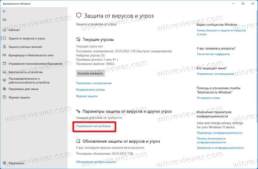 - В блоке «Параметры защиты от вирусов и других угроз» вас интересует ссылка «Управление настройками».